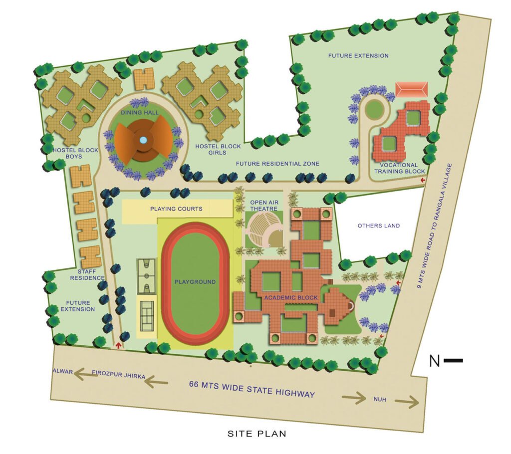 Set on 19 acres in the Gurgaon district, just off Sohna, this campus finds its context in the landscape it is named after. The Aravali mountains rise behind the site, forming a natural backdrop and lending both name and character to the institution.